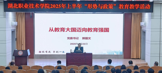 校党委书记郭国文以《从教育大国迈向教育强国》为题开展形势与政策的授课,从建设教育强国的重大意义、信心底气、总体要求等方面深入阐述,指出建设教育强国是全面建成现代化强国战略先导,我国已建成世界最大规模教育体系,未来将持续坚持教育的政治、人民、战略属性,聚焦六大特质,构建八大体系,落实五项重点任务,建成教育强国助力中国式现代化建设。郭书记通过丰富案例,让同学们深刻认识到职业教育在教育强国建设中的关键作用。课程尾声,郭书记激励同学们锚定2035年建成教育强国的目标,跑好历史的接力棒,书写以教育强国建设支撑引领中国式现代化的时代新篇。