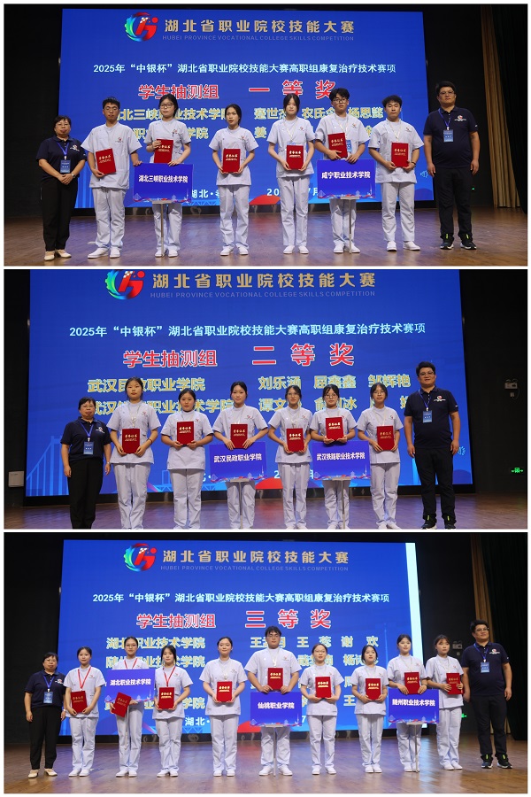 在学生抽测组,湖北三峡职业技术学院、咸宁职业技术学院获得一等奖;武汉民政职业学院、武汉铁路职业技术学院获得二等奖;湖北职业技术学院、随州职业技术学院、仙桃职业学院、黄冈职业技术学院获得三等奖。