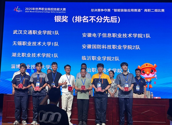 (本网讯 刘欣)8月24日至26日,2025年世界职业院校技能大赛总决赛高职组智能装备应用赛道争夺赛在浙江职业技术大学举行,来自全国的两百多支代表队同台竞技。经过三天激烈角逐,由我校机电工程学院教师黄学先、刘欣指导的钱富豪、田鑫烁、段进城、李双语等学生团队,凭借精湛的专业技能和全面的综合素质,荣获银奖。