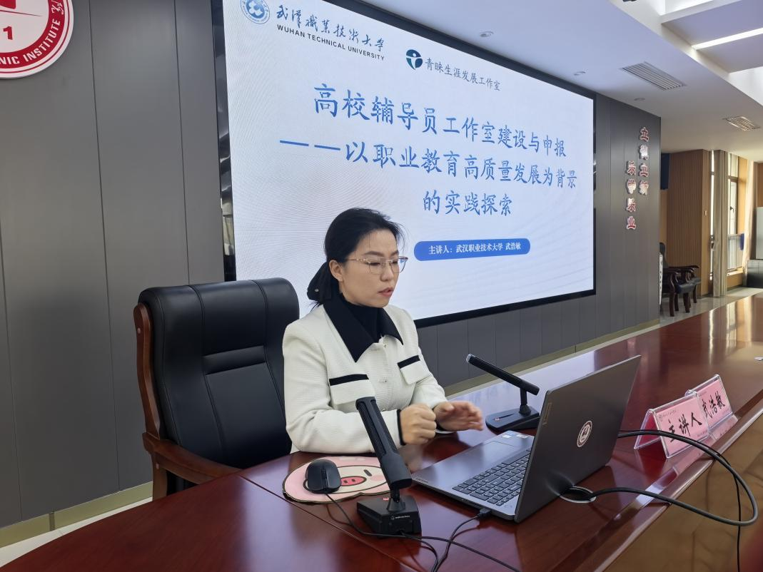 (本网讯 王欣怡)11月11日上午,学校2025年第五期辅导员专题培训在南校区图新大楼601会议室举行,培训主题为“高校辅导员工作室建设与申报”,特邀2025年度教育部高校辅导员名师工作室——青睐生涯发展工作室主持人、武汉职业技术大学光电与信息工程学院学工办主任武浩敏作专题讲座,旨在帮助辅导员精准把握职业教育背景下工作室建设的核心要求,提升团队构建、项目运营与成果转化能力。学校党委委员、副校长梅重出席活动,各学院学生工作分管负责人,全体专职辅导员和兼职辅导员代表参加培训,党委学工部部长魏俊桃主持。