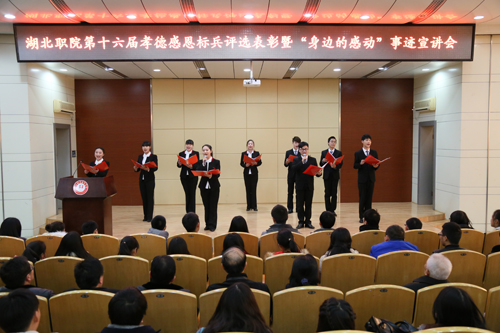 “身边的感动”事迹宣讲环节,来自学校各二级教学院的六位孝德标兵代表分别结合自身的经历、发生在自己身边的平凡事、生活中的点滴等,同大家分享了自己的感动故事。来自医学院的王少华同学,以《爱的真谛》为主题,用朴实的语言,饱含深情讲述了自己在亲人和医学院师生的关爱与支持下,与病魔抗争、绝不言弃的“爱”的感言,同时向所有关心、支持、帮助过他的人表达了无限的感激之情;财经学院的梁映婵以《感恩生命,自强不息》为主题,结合自身经历,激励95后同学要学会感恩、珍爱生命、自强不息;校新闻中心向友坤同学以《将敬业刻在心底》为主题,讲述了学校关工委常务副主任、退休老教师左德汉一辈子的敬业、奉献的故事,左老一辈子以实际行动践行自己的人生誓言,传递孝德力量,践行社会真善美,传承孝德精神,使大家感同身受、受益匪浅;来自护理学院的彭晨曦以《学会感恩,争做孝德青年》为主题和大家交流了用专业知识开展“孝心”护理志愿服务,传承孝德文化、培育科学青春价值观,传递孝德力量、践行社会真善美,传承孝德精神、实现青春梦想等方面的体会;建筑技术学院冯高龙同学以《在奉献中收获快乐》为主题,讲述自己坚持不懈开展青年志愿服务,用实际行动诠释了奉献自我、收获快乐的真情实感;信息技术学院杨永康同学以《传承美德当孝子,一专多能当义工》为主题,结合亲身经历,分享了如何以我校余志凌老师等先进典型为榜样,如何感恩父母、感恩社会、感恩生活的故事,他的经历告诉我们,只有常怀一颗感恩的心,才能让感恩成为一种习惯,才能让习惯成为一种自然。六位宣讲同学以自身、或发生在身边的平凡事迹,继承并弘扬中华民族的传统美德,将感恩之举、孝德之为在学习生活中体现得淋漓尽致。