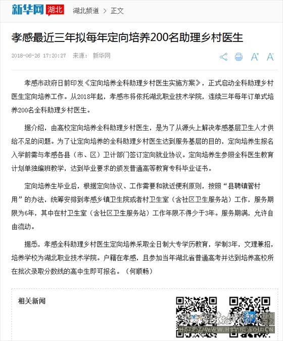 【新华网】孝感最近三年拟每年定向培养200名助理乡村医生