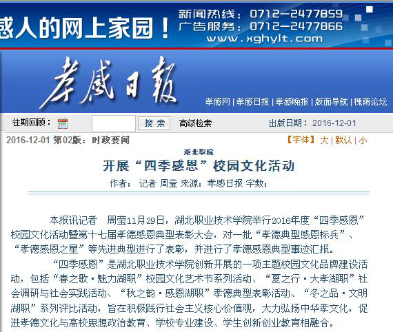本报讯记者 周莹11月29日,湖北职业技术学院举行2016年度“四季感恩”校园文化活动暨第十七届孝德感恩典型表彰大会,对一批“孝德典型感恩标兵”、“孝德感恩之星”等先进典型进行了表彰,并进行了孝德感恩典型事迹汇报。