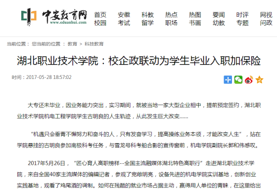 为提高育才质量,近年来,湖北职业技术学院大胆创新,打破以学校为主单一的办学模式,积极与省内外有规模的大型企业及工业园区开展深度合作,探索出校企政合作办学的崭新模式,为各类用工企业源源不断输送优秀技能人才,深受好评。