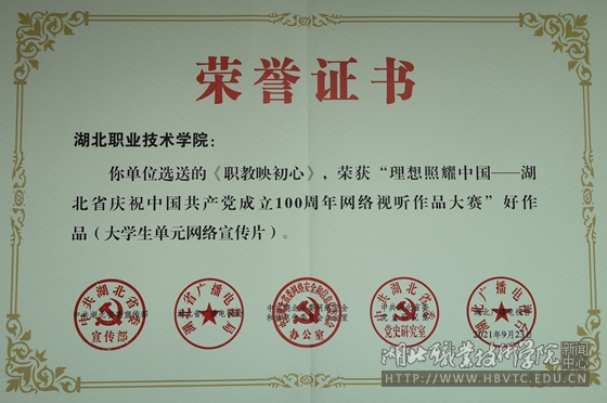 (本网记者:卢雅雪)为深入学习贯彻习近平新时代中国特色社会主义思想,隆重庆祝中国共产党成立100周年,由中共湖北省委宣传部、湖北省广播电视局、中共湖北省委网络安全和信息化委员会办公室、中共湖北省委党史研究室和湖北广播电视台联合举办的“理想照耀中国——湖北省庆祝中国共产党成立100周年网络视听大赛”圆满收官。日前,经反复遴选、多轮评审和公示,各系列获奖结果揭晓。我校自主创作的微视频《他们说》、网络宣传片《职教映初心》分别荣获好作品奖。