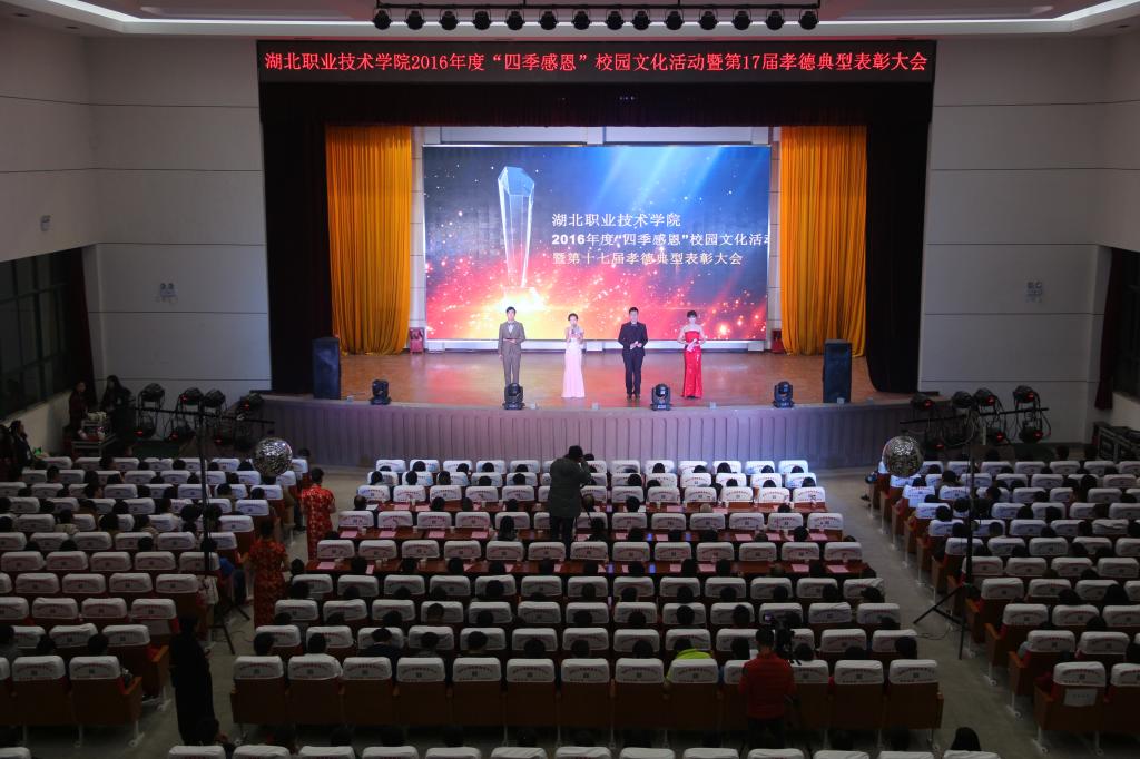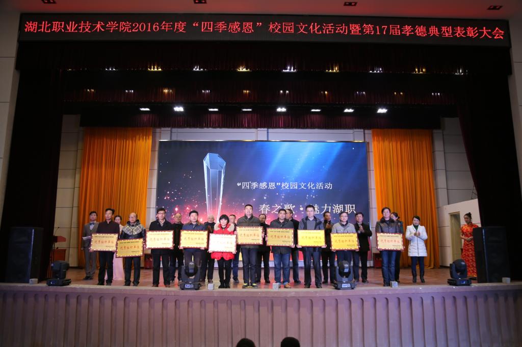 会上,出席领导和嘉宾为“四季感恩”校园文化活动受表彰的先进集体和先进个人颁奖。2016年,学校制定并实施了“四季感恩”校园文化品牌建设方略。一是开展了“春之歌•魅力湖职”校园文化艺术节系列活动,活动项目包括“两创”口号征集、诗歌、散文、微小说、摄影、微电影、金话筒等12个类别。收集作品4000多件,参与人数达2000人次,评选表彰近200人次。在精彩纷呈的校园文化艺术节系列活动中,学校师生积极响应和热情参与,报送的作品形式多样,内容丰富,且具有一定的思想性和艺术性;二是开展了“夏之行•大孝湖职”社会调研与社会实践活动,师生在暑假期间,纷纷结合专业特色及当地实际情况,开展“六个一”社会服务、社会实践和社会调研活动,如附属医院开展“为抗洪英雄义诊”活动,建筑技术学院刘帅同学结合学校招生情况开展调研等,既提升了专业技能,也服务了区域经济社会发展,产生10个优秀典型案例。三是开展了“秋之韵•感恩湖职”孝德典型评选表彰活动,活动评选表彰了27名孝德感恩标兵,24个孝德感恩先进集体,227名感恩先进个人。他们或孝敬父母,尊老爱幼,或勤奋刻苦,自立自强,或心系祖国,胸怀大志,或继承和发扬中华民族的传统美德,将孝德感恩教育和实践体现在生活的点点滴滴中。他们的典型事迹在师生中产生了良好的反响,营造了向上向善校园文化氛围。