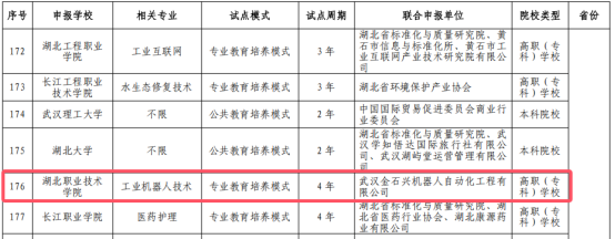 (本网讯 桂宏凡)1月29日,国家市场监督管理总局与教育部联合公示专业与标准化教育融合试点名单,湖北职院机电工程学院工业机器人技术专业成功入选,被确定为“专业教育培养模式”试点项目,试点周期4年。这标志着我校在深化产教融合、创新高素质高技能人才培养模式上迈入国家级新平台,实现了学校专业建设的又一重大突破。