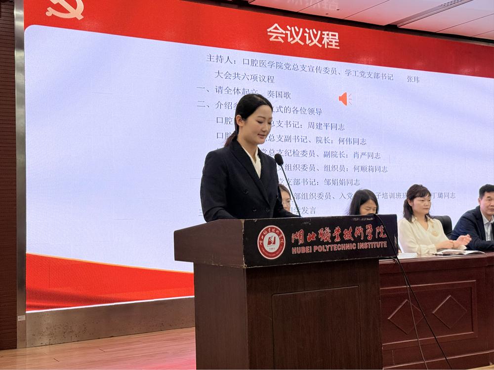 仪式在庄严的国歌声中拉开帷幕,全体人员肃立致敬,共同感受党的庄严与神圣。随后,入党积极分子代表、口腔医学院团总支副书记刘然然发言。她结合自身参与社区志愿服务、口腔专业实践的经历,分享了自己向党组织靠拢的初心与感悟,表达了追求进步、加入中国共产党的坚定决心,并代表全体学员郑重承诺:将以饱满的热情、端正的态度参加培训,认真学习、学以致用,立足专业、担当作为,以青春之力践行初心使命,彰显湖职口腔青年的责任与风采。