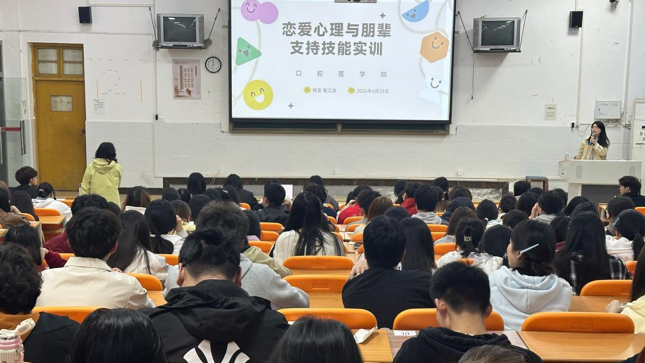 你是否也曾为爱迷茫?你是否曾因告白受挫陷入自我怀疑,相处争吵内耗不断,失恋后久久无法释怀?为帮助学子厘清恋爱困惑、掌握朋辈支持技能。口腔医学院心理部于2026年4月23日晚上七点在东区阶梯教室101组织开展以“恋爱心理与朋辈支持技能实训”为主题的心理信息联络员培训。本次培训由杨玺老师和甄江波老师主讲,全院各班级心理委员及寝室长共计218人参与,疏导恋爱心理,提升朋辈帮扶能力。