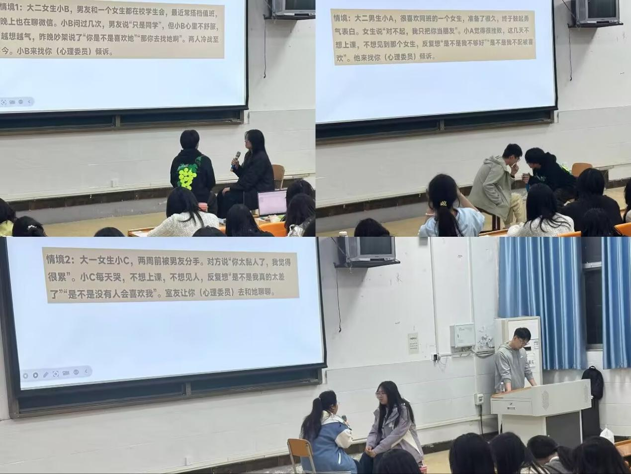 作为心理委员和寝室长,又该如何陪伴陷入情感困境的朋友?甄老师带大家通过两场情景模拟,演练不同场景的回应方式,让在场学生把“安慰雷区”和“暖心句式”牢牢记在心里,学会用温柔的力量,给朋友一个安全的心灵港湾。