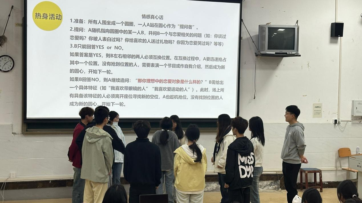 活动开场,甄老师用一场轻松有趣的“情感真心话”游戏打破陌生感。大家围成圈,一名同学随机提问关于恋爱的小问题:“你被人表白过吗?”“你为喜欢的人做过最勇敢的事是什么?”其余同学用简单的“YES/NO”互动,快速拉近彼此距离,卸下心理防备,让每个人都能在轻松氛围里,直面自己的恋爱心声。