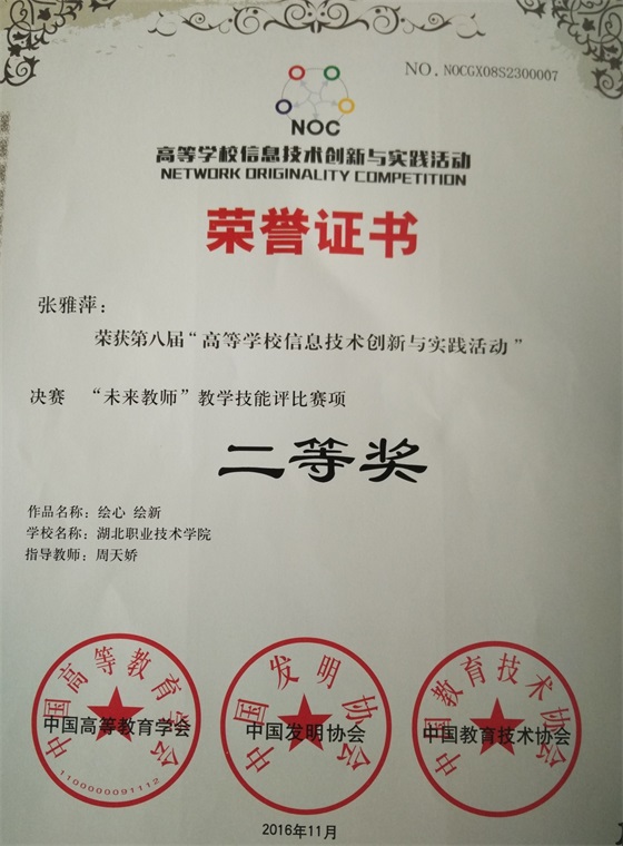 近日,全国“高等学校信息技术创新实践活动”决赛“未来教师”教学技能评比赛项在江苏无锡圆满落下帷幕。我校艺术与传媒学院2014级学前教育专业学生张雅萍在2016年湖北省大学生信息技术创新大赛中荣获一等奖,代表湖北省参加了全国比赛,由指导教师周天娇指导的作品“绘心 绘新”荣获全国二等奖。