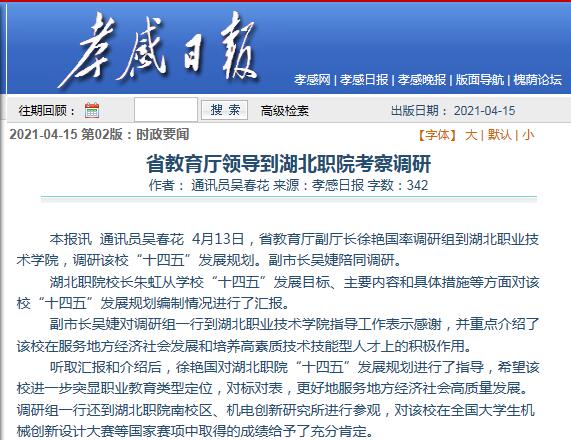 4月13日,省教育厅副厅长徐艳国率调研组到湖北职业技术学院,调研该校“十四五”发展规划。副市长吴婕陪同调研。