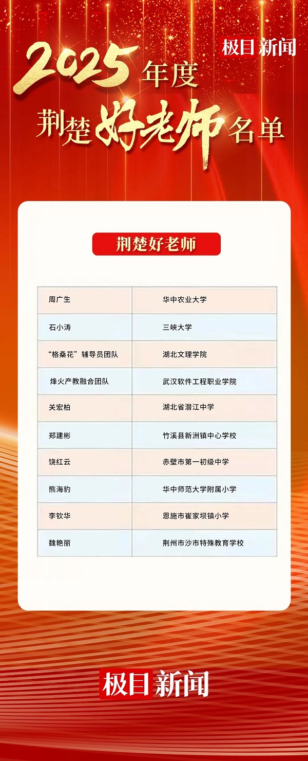 2025年“荆楚好老师”身影闪亮——他们是乡村教育的摆渡人,是数字未来的筑梦者,是长江生态的守护者,更是特殊生命的点灯人。他们是全省教师群体躬耕教坛、立德树人的典范,是新时代的筑梦人。